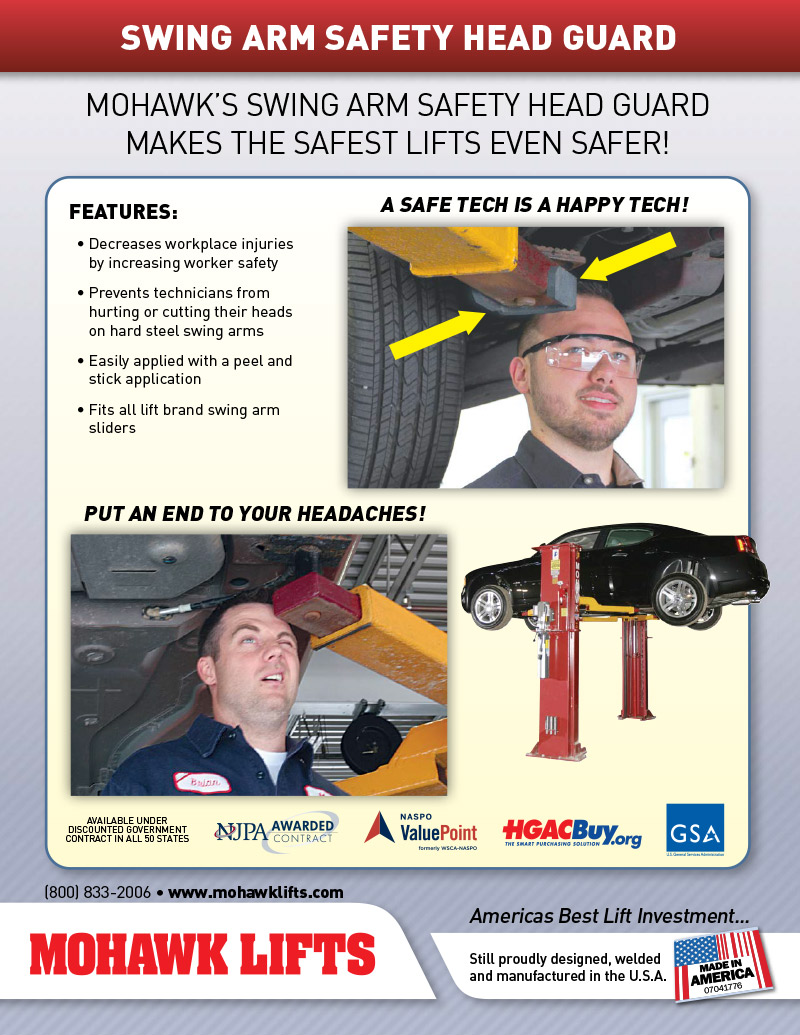 <a href="/automotive-lifts/specialty-items/2-post-automotive-lift-swing-arm-safety-head-guard/">Learn more about the safety head guard</a> Decreases workplace injuries by increasing worker safetyPrevents technicians from hurting or cutting their heads on hard steel swing armsEasily applied with a peel and stick applicationFits all lift brand swing arm sliders